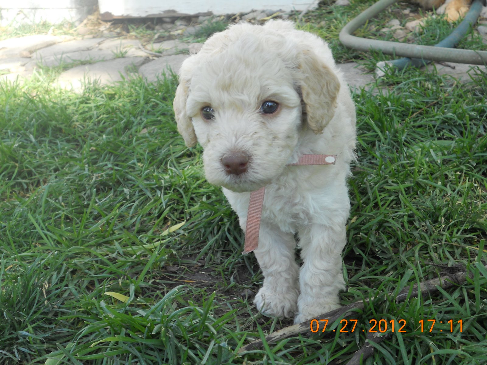 | Orange ribbon girl... we call her Polar Bear, she was the lightest pup at birth and seems to be getting a little darker. |